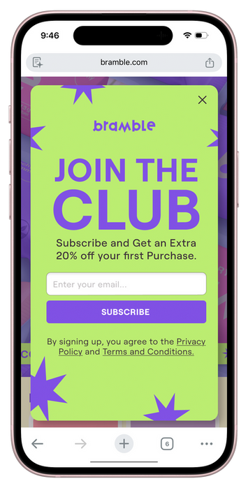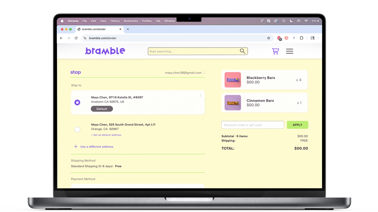 Channeling all the bright colors, patterns, and movement of the brand toward a website that felt user-friendly and exciting proved a challenge, but through graphics, buttons, and pop-ups, I managed to pull in some of the "distinctly Bramble" elements. Ultimately, considering that Maya and Jordan are young, on-the-go adults, I opted to design with a mobile-first perspective, then moved to desktop view.